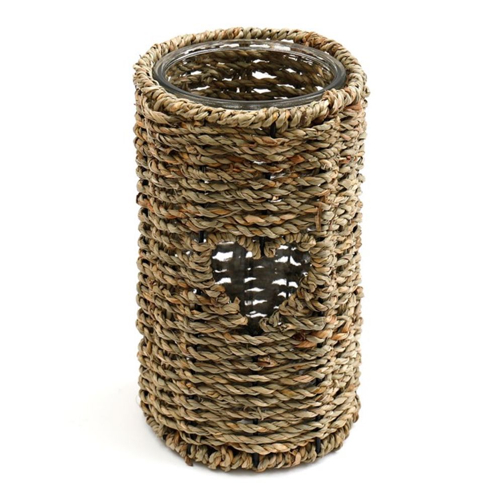 A 21cm twisted seagrass candle holder with heart cut out and glass insert. Makes a simple accent for the home.