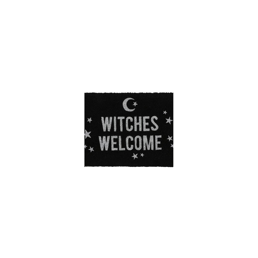 A back coir doormat with printed 'Witches Welcome' text surrounded by a crescent moon and stars. Makes a fun welcome at the front door of any witch's home. Design may fade in extreme weather. Suggested for sheltered and indoor use only.