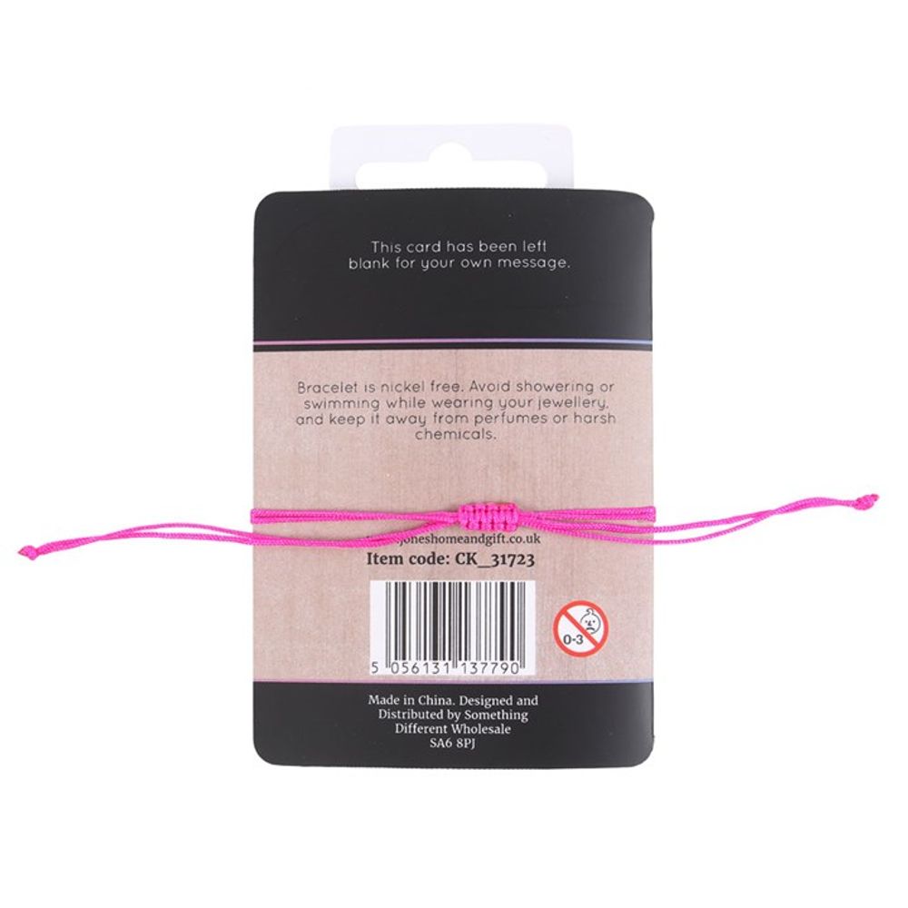 Balance and realign the crown chakra with this pink string and metal charm bracelet. Presented on a matching backing card that reads, 'Universe, divinity, consciousness, source, presence & energy'. Product Dimensions: H1.9cm x W2.4cm x D0.8cm Packaged Dimensions: H2.3cm x W13cm x D2cm