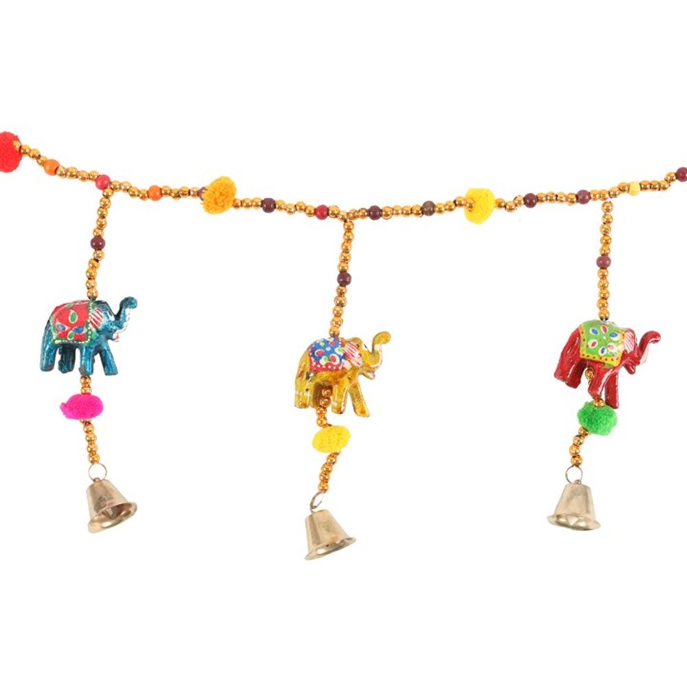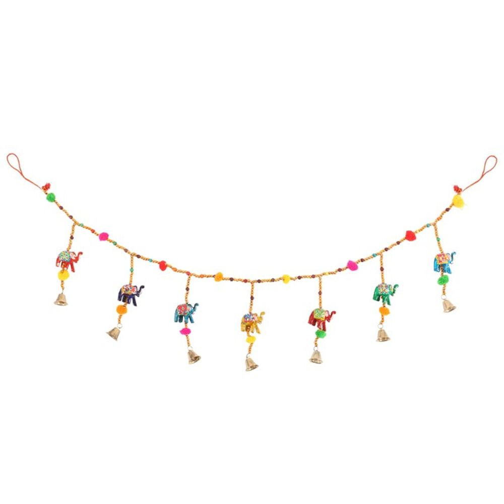 This exquisite garland from India is strung with detailed wooden elephant figures, a sacred symbol of protection in Hindu tradition, and is finished with a variety of coloured and gold beads and pom-poms. Each elephant is adorned with a small bell, creating a gentle ring with every movement, making it a perfect piece to enhance the spiritual and aesthetic appeal of your home.