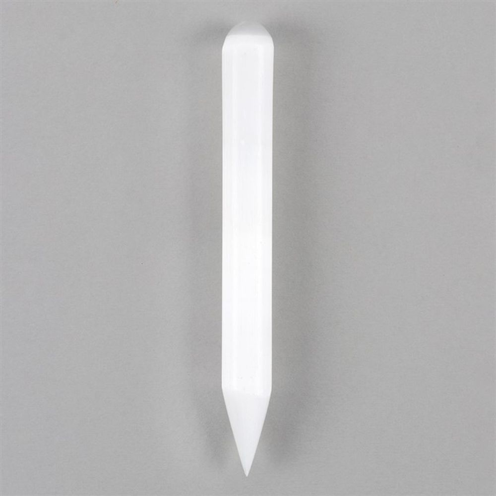 Large, beautifully crafted selenite stilo wand with one pointed end. These wands are commonly found in energy tool boxes of spiritual wellness professionals or used by white witches who utilise them for magical workings.Packaged Dimensions: H14.5cm x W1.7cm x D1.7cm"
