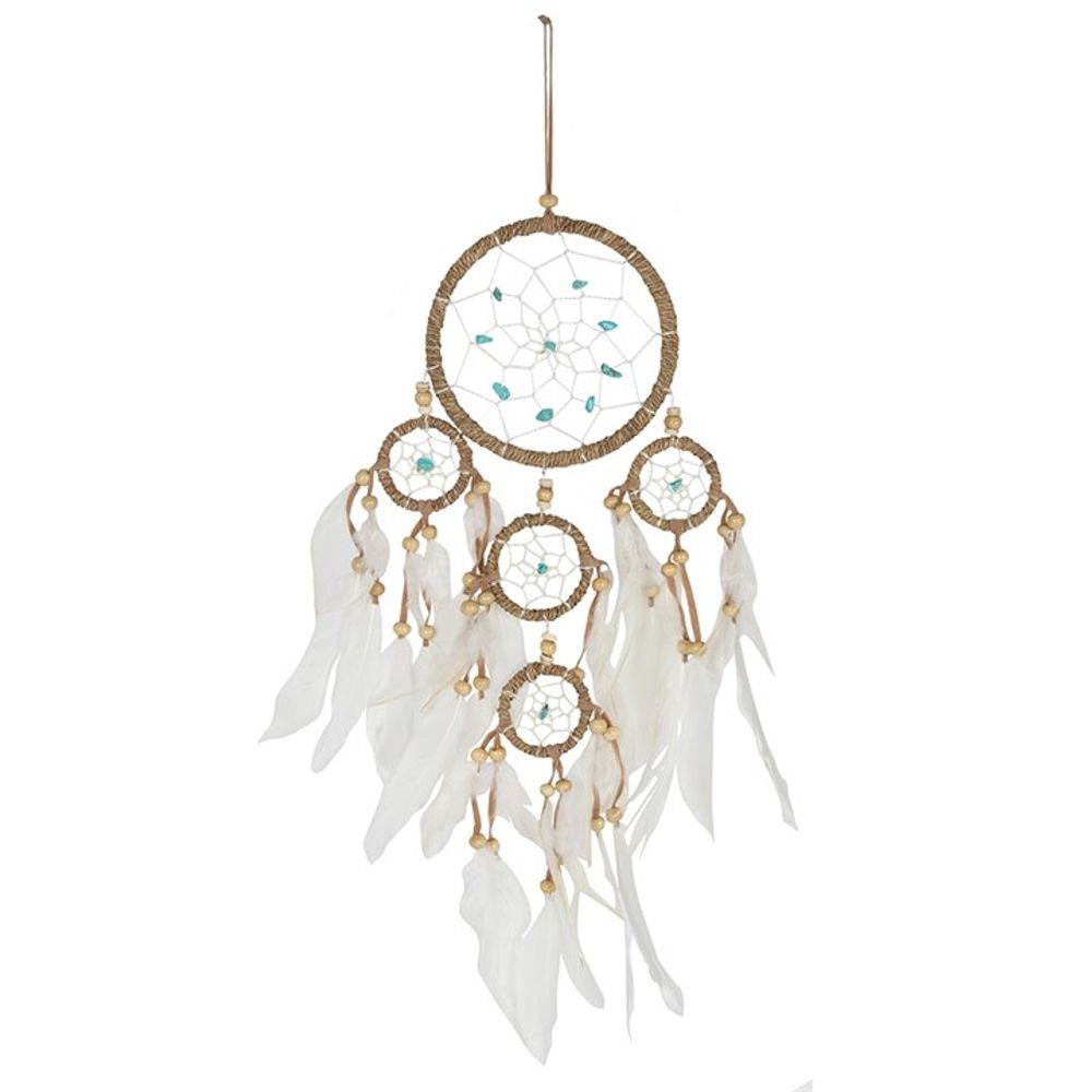Ward off evil spirits with this Native American inspired, rope-wrapped dreamcatcher that features five white string webs accented with beautiful turquoise stones and fabric tassels finished with wooden beads and white feathers. Largest hoop measures approximately 12cm in diameter. Product Dimensions: H50cm x W20cm x D0.5cm Packaged Dimensions: H18cm x W13cm x D2cm