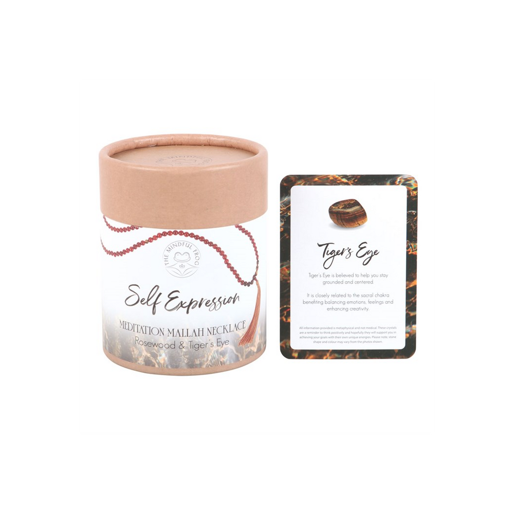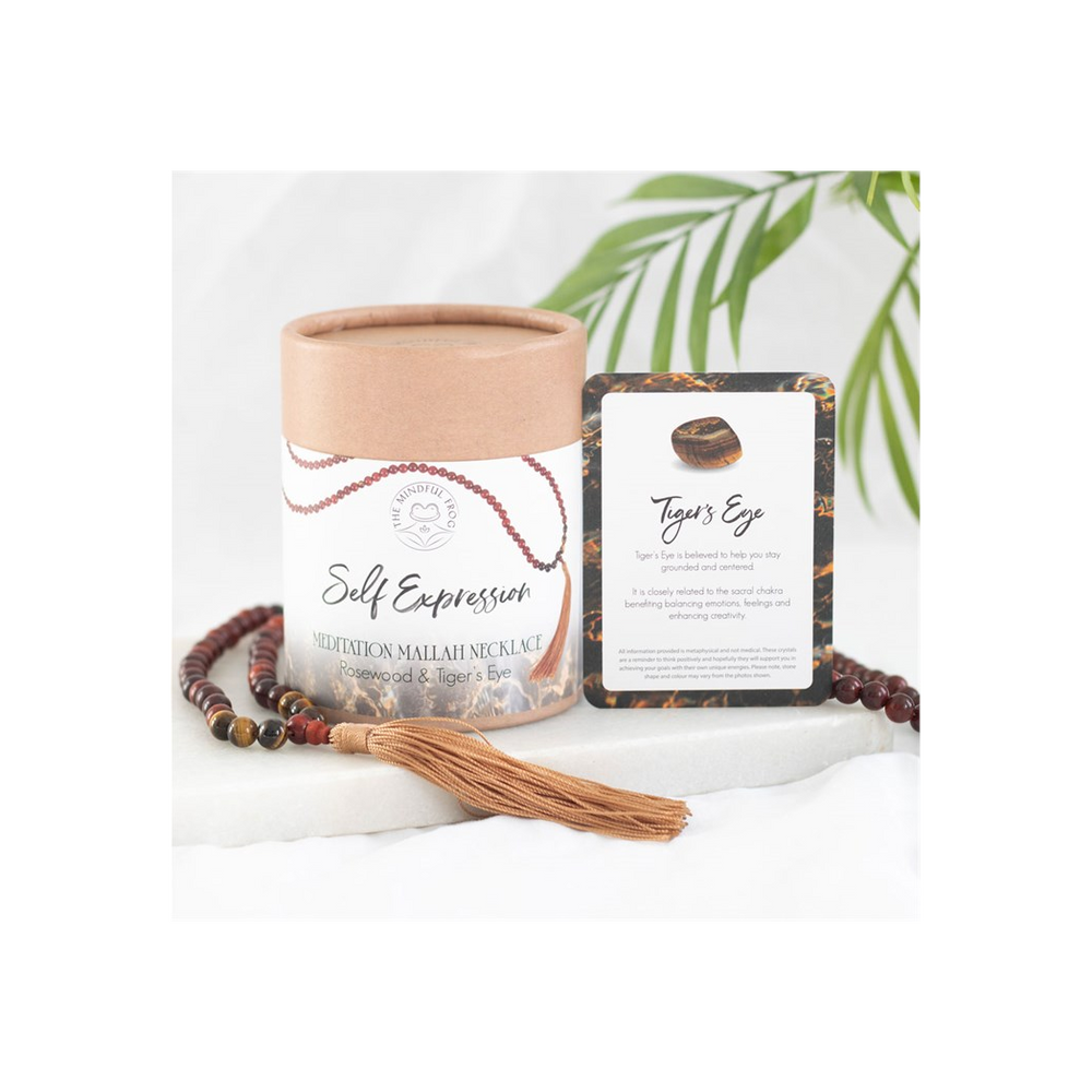 Crafted from rich, warm rosewood beads and interlaced with striking Tiger's Eye stones, this elegant necklace displays 108 beads — a traditional count in Mallah necklaces symbolizing a spiritual journey and mindfulness — and is completed with a decorative tassel. The Tiger's Eye, known for its empowering and protective qualities, is associated with the throat chakra, fostering self-expression and communication. It is believed to enhance confidence, encourage clear thinking, and empower the wearer to speak their truth with clarity and courage.  A Mallah, or Mala, necklace is a string of beads traditionally used in meditation and prayer in various spiritual practices including Buddhism and Hinduism. Each bead represents a repetition of a mantra or prayer, aiding in focus and spiritual contemplation. To use simply hold the necklace in one hand and move from bead to bead whilst focusing on mindful breathing and repeating an intention. The necklace can be worn throughout the day as a reminder of these intentions.  Each Mallah Necklace is presented in a beautifully designed box, accompanied by a corresponding information card, making it an ideal and thoughtful gift for a loved one who values communication, confidence, and personal growth.