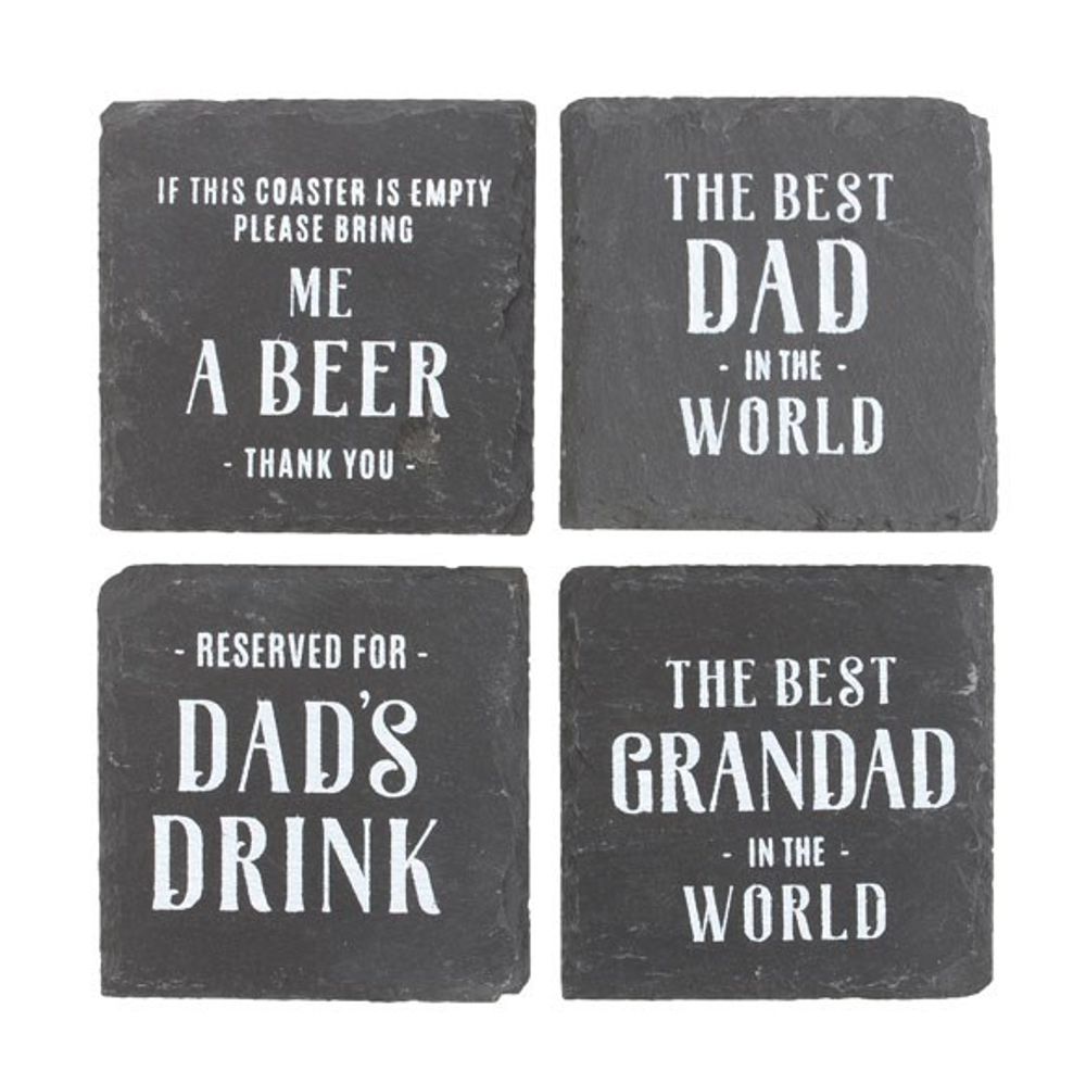 Add a touch of humour and appreciation to his daily routine with these slate coasters, perfect for Father's Day. Each one carries a message that's both cheeky and endearing, from a playful beer request to a tribute to his status as the best dad or grandad. These coasters protect his surfaces while showing him how much he's valued every day. Sold as a set of 24 coasters in a matching cardboard display.