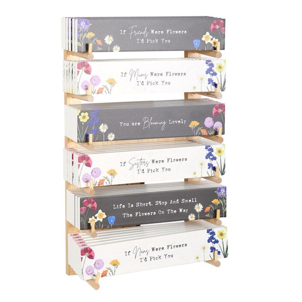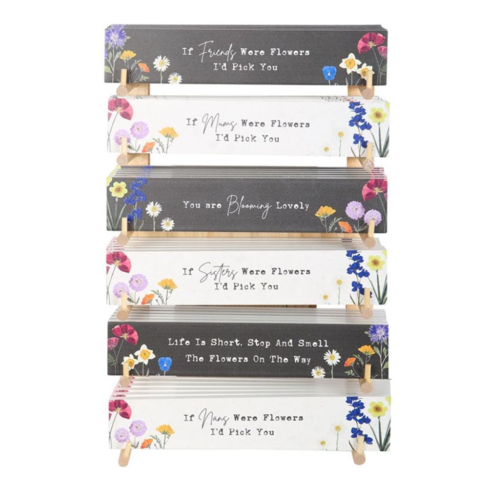 Brighten up birthdays and warm hearts on Mother's Day with this display of 36 wildflower block signs for Her. Timeless and elegant, these signs feature 6 different meaningful phrases for every special woman in one's life. Styles include, "If friends were flowers, I'd pick you", "If nans were flowers, I'd pick you", "If sisters were flowers, I'd pick you", "If mums were flowers, I'd pick you", "You are blooming lovely" and "Life is short. Stop and smell the flowers on the way" accented by lifelike wildflower designs. Sold as a set of 36 on a retail display stand, equally assorted.