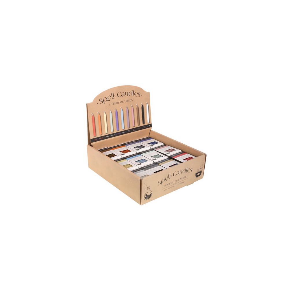 Enhance your magical practice and manifest your intentions with this set of 48 unscented spell candles. Candle magic is one of the simplest forms of spell casting in which the caster decides on a goal, visualizes the end result and focuses intent to manifest that result. Packaged in a beautifully designed cardboard display featuring a description of each candle's intent. The colour of a spell candle holds significant symbolism and corresponds to different intentions and energies, making it an essential element in ritual and spellcasting. Typically, the caster will write down their intent on a piece of paper the same colour as the candle and burn the paper in a fire safe bowl. Each pack includes 12 spell candles, and the display includes 4 packs each of the following colours: red for passion, orange for attraction, yellow for happiness, green for abundance, light blue for harmony, blue for communication, purple for stress less, pink for self love, brown for grounding, black for banish negativity, white for healing and mixed spell candles.