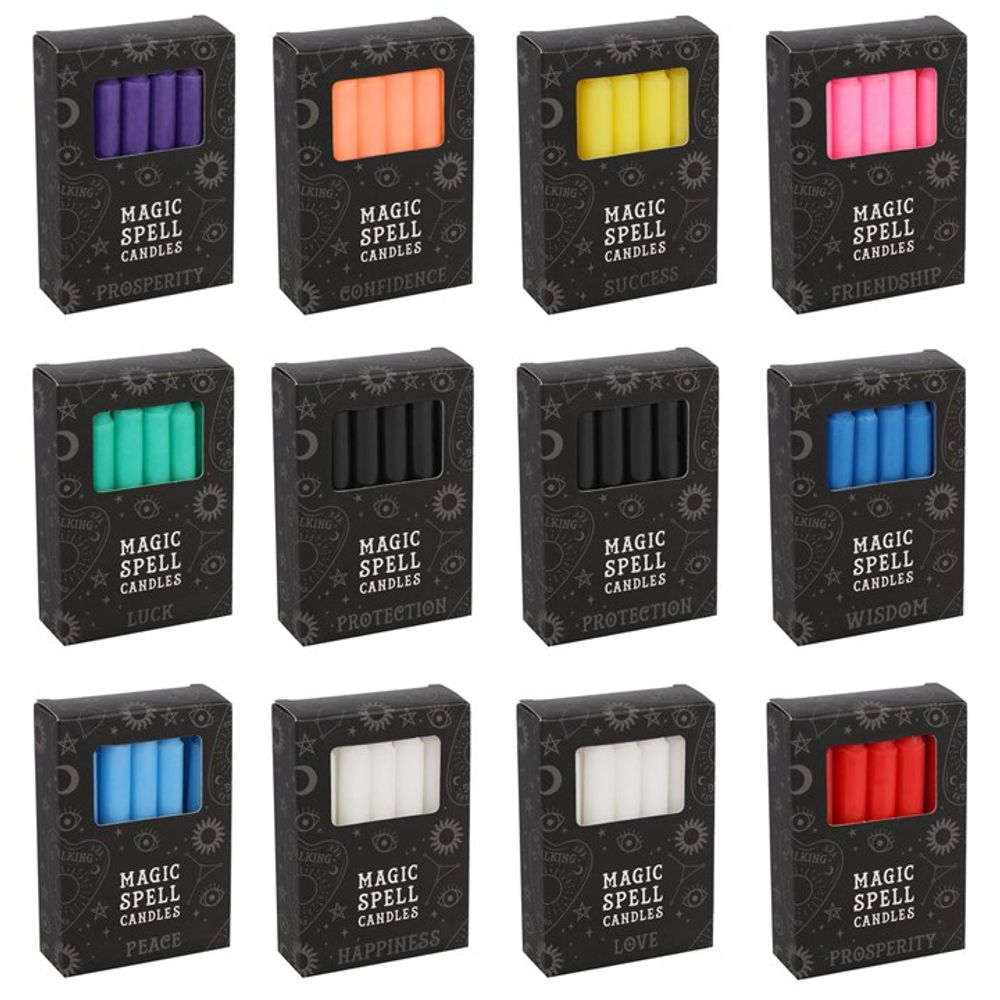 This set of 72 unscented spell candle packs is designed for easy top-ups and custom merchandising displays. Candle magic is one of the simplest forms of spell casting in which the caster decides on a goal, visualizes the end result and focuses intent or will to manifest that result. Typically the caster will write down their intent on a piece of paper the same colour as the candle, and burn the paper in a fire safe bowl. This set includes 6 packs of each solid colour and 12 packs of our mixed variety, with each pack containing 12 individual spell candles. Colours include purple for prosperity, orange for confidence, yellow for success, pink for friendship, green for luck, black for protection, blue for wisdom, light blue for peace, white for happiness and red for love. All of our spell candles are solid colour all the way through (not dipped). Each candle has an approx burn time of 1 hour. Made from paraffin wax. Colour may vary slightly between production batches.