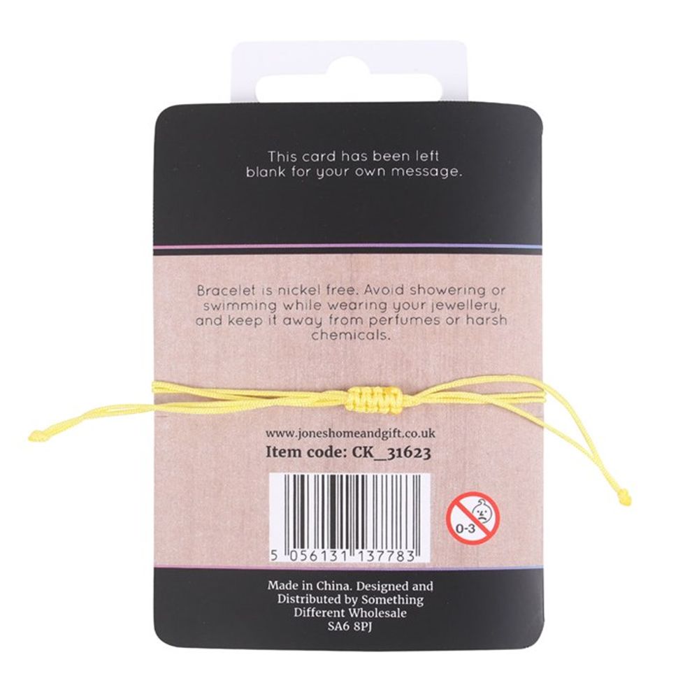 Balance and realign the solar plexus chakra with this yellow string and metal charm bracelet. Presented on a matching backing card that reads, 'Willpower, self-esteem, intellect, independence, responsibility'. Product Dimensions: H1.9cm x W2.4cm x D0.8cm Packaged Dimensions: H2.3cm x W13cm x D2cm