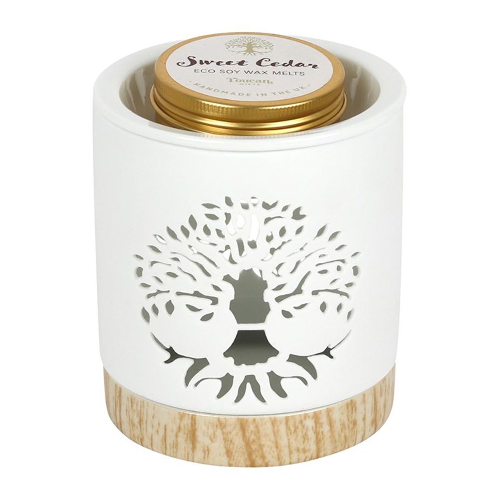 Fragrance the home with this elegant Tree of Life wax warmer gift set. A white ceramic burner is accented by a wood-effect base and a stunning Tree of Life cut out design. Set includes a tin of eco soy wax melts in the scent 'Sweet Cedar' that exudes the feeling of forest walks and cabin getaways. Product Dimensions: H10.5cm x W9.5cm x D9.5cm Packaged Dimensions: H16cm x W11.5cm x D11.5cm