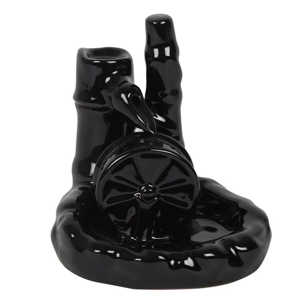 A black ceramic backflow incense burner with a water wheel and bamboo design. When a backflow cone is placed on top, smoke gently flows from a fountain spout and replicates water falling over an old fashioned water wheel. Product Dimensions: H12.5cm x W12cm x D10.5cm Packaged Dimensions: H15.5cm x W12cm x D10.5cm