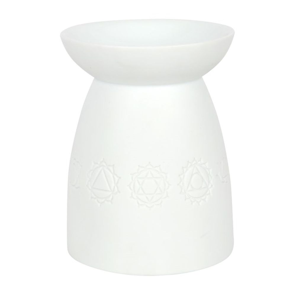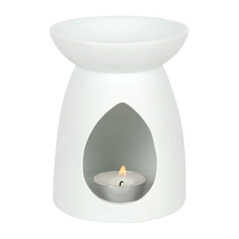 Timeless and elegant, this matte white oil burner features a subtle Seven Chakras design which is softly illuminated when a lit tealight candle is placed inside. Use with your favourite fragrance oils or wax melts to add beautiful scents to your home. Product Dimensions: H12.5cm x W9.5cm x D9.5cm Packaged Dimensions: H14.5cm x W11.5cm x D11.5cm